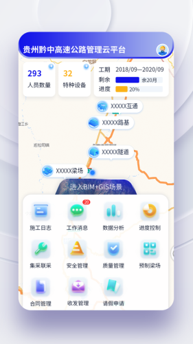 其中包括首页、BIM+GIS、人员管理、设备管理、日常任务、工作消息、数据分析、进度控制、甲控材料、安全管理、质量管理主要功能为用户提高工作效率,