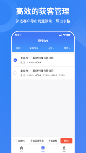 保存通讯录:采集数据一键保存到手机通讯录,打开微信一键添加,添加微信通过率也大大提升