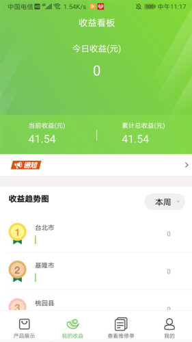 在该APP内用户可以查看收益看板,可以维护自己的店铺信息,