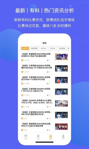 每天都有新鲜的电竞赛事和游戏资讯滚动更新,即使错过了比赛,也可以在资讯区回顾精彩的赛事内容。还有劲爆的战队选手八卦、游戏攻略等着您来发掘。