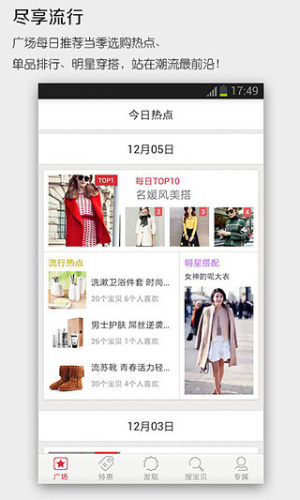 广场每日推荐当季选购热点、单品排行、明星穿搭,站在潮流最前沿!