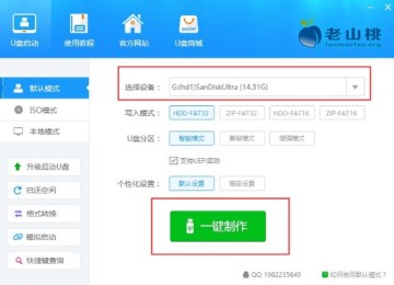 3、安装完成后打开老山桃软件,在电脑上插入U盘,软件会自动识别到U盘的信息,若您无特别需求,无需做任何改动,直接点击“一键制作”即可。如图所示