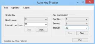 你所要做的就是选择按键(数字,字母,功能或特殊键)和时间间隔(秒),并初始化通过点击一个按钮,任务。停止操作需要用户干预,但。有没有其他的选项,可以通过这个工具。