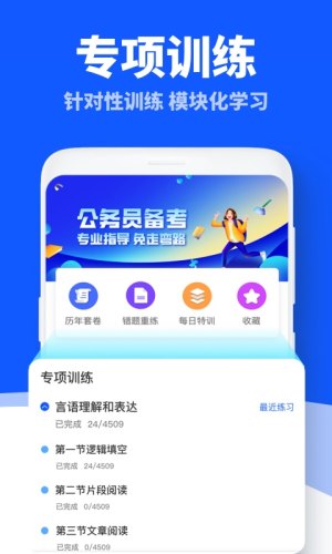 一款公务员备考App,集历年题库、专项训练系列课程、申论资料、行测资料、面试资料、常识资料、法律资料。