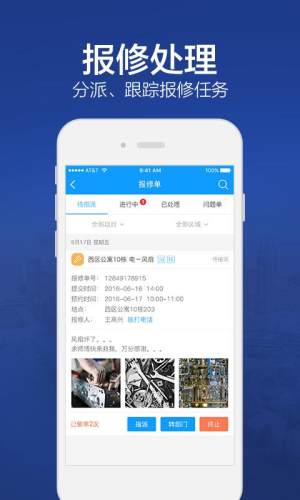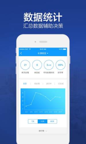 管理人员可通过App对师生提交的报修、服务监督等申请进行处理和管理,对工作进行多维度的数据统计。