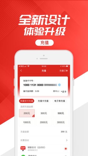 同时支持加油卡信息维护、自助挂失、在线申办加油卡、油耗分析、充值优惠、在线客服、会员与积分功能,支持多种充值方式。