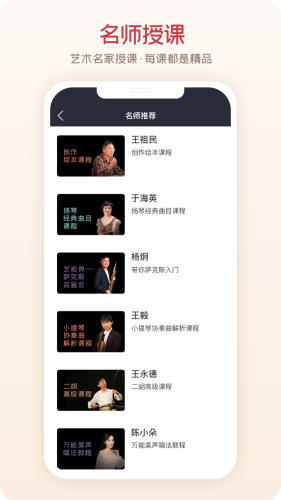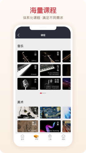 涵盖了音乐、美术、书法/篆刻、舞蹈等艺 术⻔类,已签约全球数百位知名艺术家网络教学版权,拥有录播课程资源超5w+,设计了一 套全面科学的课程体系,满足学员不同阶段的学习需求,让你轻松、高效在线学艺术。
