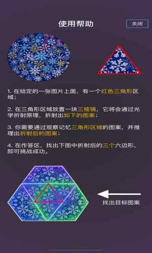 2、通过三棱镜的折射原理,推理出在该位置摆放三棱镜后,通过光学折射呈现出的三朵雪花图案,并在备选海量雪花里面,正确找出来。