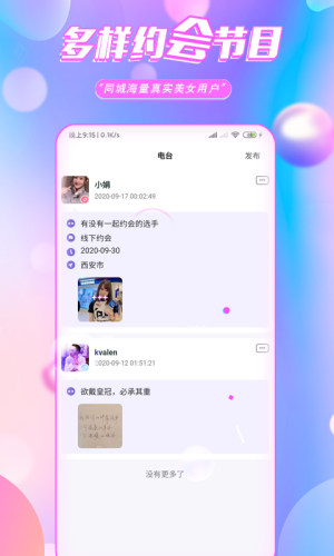【丰富的约会节目】 发布看电影、吃吃喝喝、玩游戏、运动、旅游等约会节目的广播,清晰直接高效