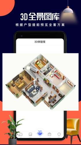 室内设计app,家装必备应用;装修避坑,了解更多知识免去超支烦恼;寻找灵感,海量装修图库分享;3D全景图库,根据户型提前预览全套方案;装修工具,三大装修实用小工具。