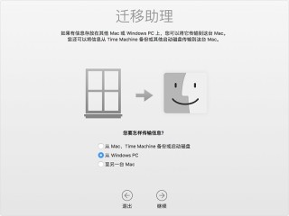 在 Mac 上,按照屏幕上的提示操作,直至到达迁移助理的迁移面板。选择“从 Windows PC”这一信息迁移来源选项,然后点按“继续”。