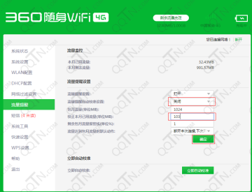 设备开机状态,开启流量提醒功能,指示灯显示绿色并快闪5次