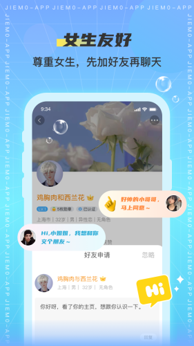 好友推荐、广场动态、群聊、交友帖、话题讨论,都能创造多重机会让有趣的灵魂们相遇。我们特别重视女生的体验,尊重你的交友意愿。不作随机搭讪,先加好友才能聊天,申请仅限一次,拒绝怪蜀黍和没礼貌的骚扰。