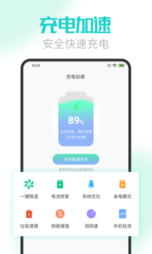 准确实时显示当前剩余电量以及其电池续航时间 ,提示您做好相应准备。插上电源,即可享受极速充电模式,大大加快手机充电速度,有效节约30%充电时间;
