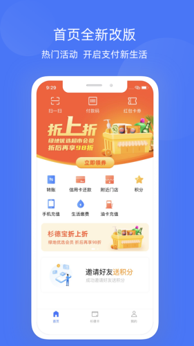 杉徳宝除了提供支付、转账、收款等基础功能外,还支持预付费卡消费、积分兑换、电信移动话费等!在轻松消费的同时,还能积分兑换,让商业与生活更加便捷!