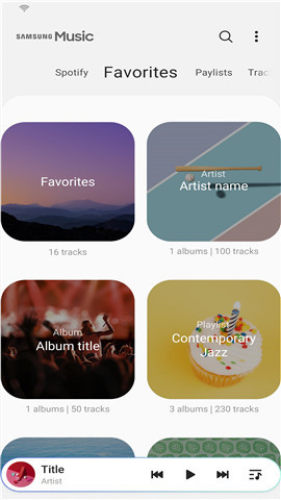 5.三星音乐显示来自Spotify的播放列表推荐。您可以通过Spotify标签找到Spotify推荐音乐,然后搜索自己喜欢的Spotify音乐。