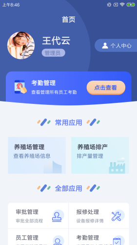“养殖场管理”,“养殖场排产”、“审批管理”、“员工管理”,“报修处理”等,解放管理员的双手,节省时间、降低管理成本、提高效率