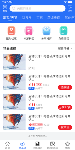 精品课板块是一个知识付费板块,这里有全网最全、最优质、最具性价比的电商培训课程。