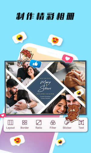 相框:数以百计的时尚框架布局让您选择难忘的独特艺术照片 编辑你的照片 贴纸:从500多个生动的贴纸中进行选择,这些贴纸分为纹身,皇冠,幽灵,动漫等主题,可以插入您的照片中