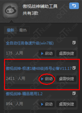 4.在傲视战神辅助工具中“启动”“傲视战神-极速1键48级|练号必备”