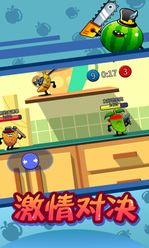 欢乐的水果大对决,使用武器将对方击倒,然后你就可以获得胜利,规则非常简单;