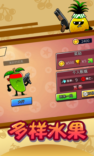 一款休闲益智的水果PK小游戏,玩法操作简单,游戏充满乐趣!游戏之中你将会扮演水果射手来进行战斗,去解锁不同的武器来进行使用,利用自己精湛的射击技巧来将对手消灭,快速的通过关卡之中来收获到多重的奖励。
