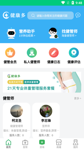 健康多app,同城医学营养一站式服务平台。软件精选同城营养产品,搭配营养助手,一分钟打造健康营养计划,还有专业健康师在线咨询,健康评估,帮助健康生活。