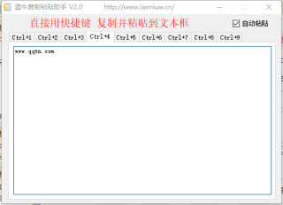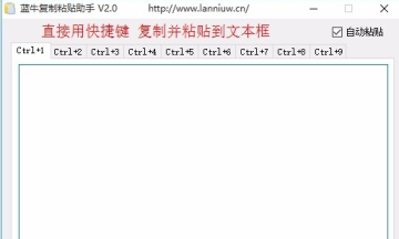 蓝牛复制粘贴助手是一款简单易用的剪贴板增强工具,旨在帮助用户将常用文本绑定到对应热键,以实现快速复制常用文本,或者游戏一键喊话。其具备了简单直观的操作界面,启动程序后,用户可以分别为Ctrl+1至Ctrl+9分别配置不同的文本内容,随后在文本编辑器或者任意位置下即可通过快捷键一键执行复制。总的来说,蓝牛复制粘贴助手带来了简单快捷复制方案,允许您快速执行复制粘贴操作,而且允许将程序隐藏到后台,使用非常方便。