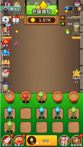 在游戏中,通过合成植物来获得更高等级的植物。拖动植物到上方的5个花盆中,消灭来袭的僵尸们。 等级越高的植物,攻击力和攻击速度也越强,快快加入,一起用植物消灭僵尸,保卫家园吧!