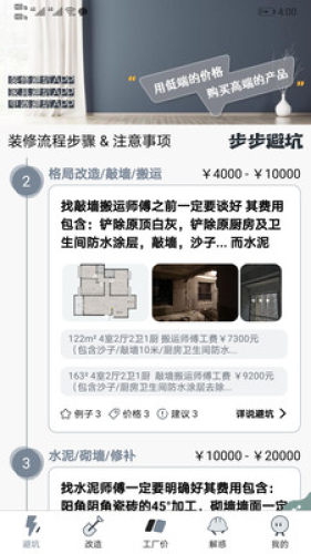 2、装修避坑:装修流程全方位解说和各个装修节点注意事项和避坑方案,让您规避所有不必要的装修烦恼。