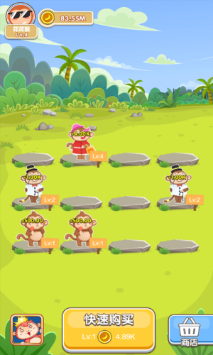 一款选用可爱卡通设计风格打造而成的休闲娱乐放置类手游,游戏里面有着很多不一样类型的猴子,他们将给你产生金币盈利奖赏。