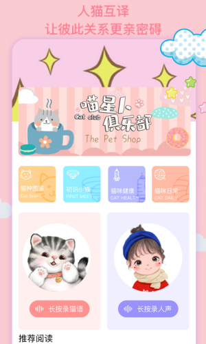 猫语翻译机app是一款非常好用的手机在线人宠互译帮手。让你和你的爱宠交流无障碍,还有各种热门的叫声,和你的小宠甜蜜互动。感兴趣的朋友不要错过了,快来下载体验吧。