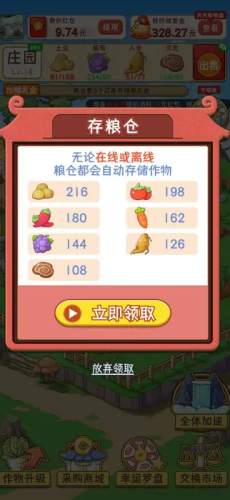 模拟经营休闲小游戏。在庄园中,用户可以播种作物、给作物浇水、生产收获作物,获得作物红包奖励,完成各种任务更是能获得更大金额的红包。还可以根据订单需求,完成订单后可以赚到更多的红包,更有全体浇水加速增强游戏体验