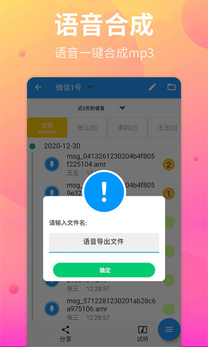 语音导出助手是一款手机好友语音转发软件,致力于帮助保险、微商、律师、客服等长时间使用微信语音对话的人群提高工作和学习效率,