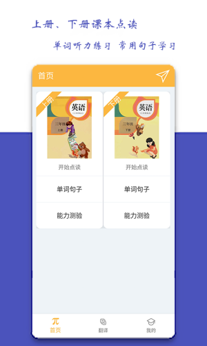 小学三年级英语派含上下册课本同步点读,单词及常用句子听力练习,单元检测,期中期末测试等功能,是课外学习的好助手。