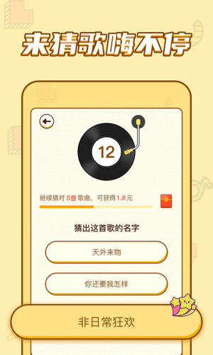 趣猜歌是一款娱乐应用APP,通过试听歌曲的片断,选择正确的歌名,答对后会得到相应的奖励,在趣猜歌里一较高下,看看谁才真正的猜歌大神。