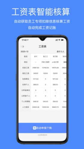 人人会拍照,人人会记账!通过拍发票,自动完成记账,通过花名册人员信息采集,释放HR的双手,提高工作效能,提升员工使用体验,自动完成工资薪酬核算、自动生成工资表、自动生成工资凭证、人员社保公积金设置等。实时生成财务报表,一键申报。