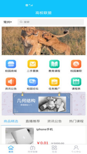 高校联盟主要包含以下九个板块:校园商城、二手置换、教育课程、校园兼职、资讯公告、校园论坛、任务推广、课程表、同学直播等内容。