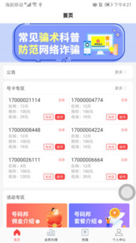 海航通信号码邦app,具备话费充值、订单管理、工号申请、开卡提卡等功能的APP,功能齐全,活动丰富,为你带来更多优质套餐,完成任务赚佣金。