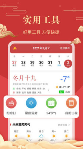 黄历宜忌、节日节气、吉日查询、天气预报于一身的日历软件。