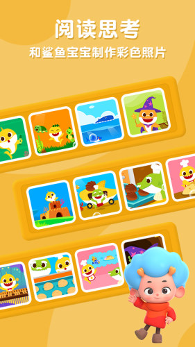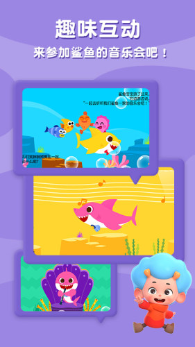 小朋友可以和鲨鱼宝宝开音乐会,坐上快鱼巴士去冒险,认识保卫海底世界的鲨鱼警察,还能品尝面包师鲨鱼爷爷的贝壳面包……试一试点击动画里的角色,还会有意想不到的互动效果哦~