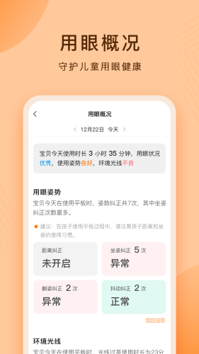 3、用眼概况:家长可以在护眼平板APP上了解孩子使用平板时的用眼习惯、姿势和环境光线