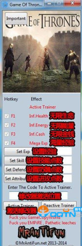 权力的游戏八项修改器是一款由国外大神MrAntiFun专门针对《权利的游戏》制作的游戏修改器,这款修改器拥有无限生命、无限金钱、无限能量、无限经验等修改功能,帮助玩家更轻松的通关游戏,是懒人玩家的福音!