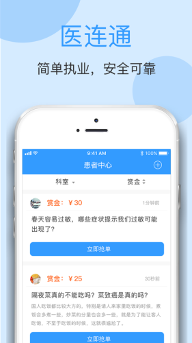 【首页】医连通首页即为患者中心,软件为你提供有健康咨询的患者列表,医生可以根据自己的擅长选择对应科室的患者进行一对一咨询服务。