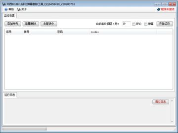 点击“添加帐号”按钮在弹出来的框中输入相关信息,获取cookie后,保存即可,如果有多个帐号,重复此动作。选中需要监控的帐号,设置好间隔运行时间,选择要监控的参数(评论及弹幕)后,点击“开始监控”按钮,程序即开始运行。