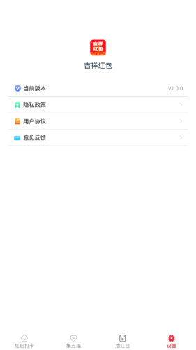 吉祥红包是一款好玩的任务类app,用户可以每天打卡,瓜分金币;同时也可以参与集五福活动;另外用户也可以在开红包页面,获取金币。