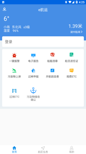 e航运app是一款便捷办公服务工具,软件拥有一键报警,电子报告,污染物上岸,过闸etc,过闸申报等等功能服务,需要的朋友欢迎前来下载使用。