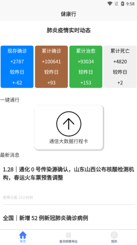 健康行app,疫情生活服务平台。软件为用户提供国内外疫情实时动态数据,支持各个国家、省份疫情数据播报,软件和微信防疫行程卡小程序绑定,支持支持通信大数据行程卡扫描出行。