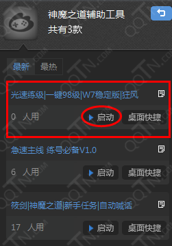 4.在神魔之道辅助工具中“启动”“光速练级|一键98级|W7稳定版|狂风”