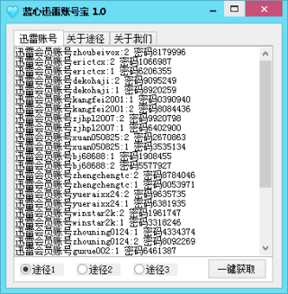 蓝心迅雷账号宝,是一款免费的迅雷会员账号获取器,每天能够获取大量新鲜可用迅雷VIP账号。提供了三个获取途径,确保大家都能拿到可用的账号,进行免费使用。工具完全免费,只在于分享,需要的朋友下载收藏!